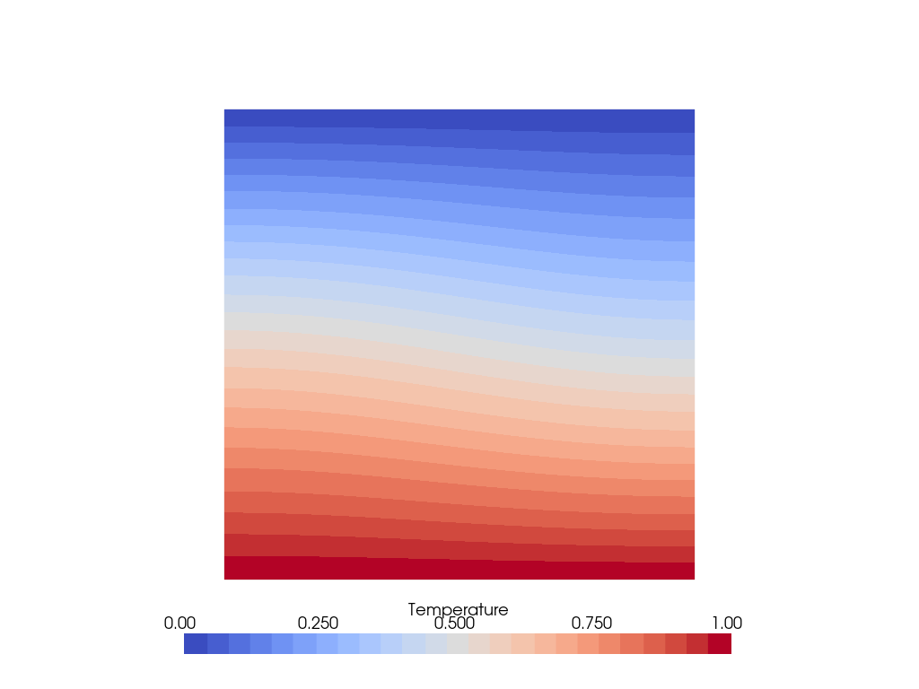 As before with the base case, the buoyancy differences due to the starting temperature configuration drives an overturning flow. You should see that the temperature field at the final time is very similar to the base case result - in fact they are the same!